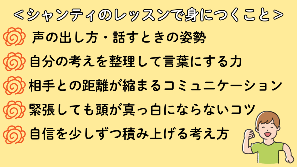 自分に自信が持てるようになり、多くの人と緊張せずに話せるようになりました。また、会話が続くようになり、会話が楽しくなりました。周りから「明るくなったね」と言われました。
